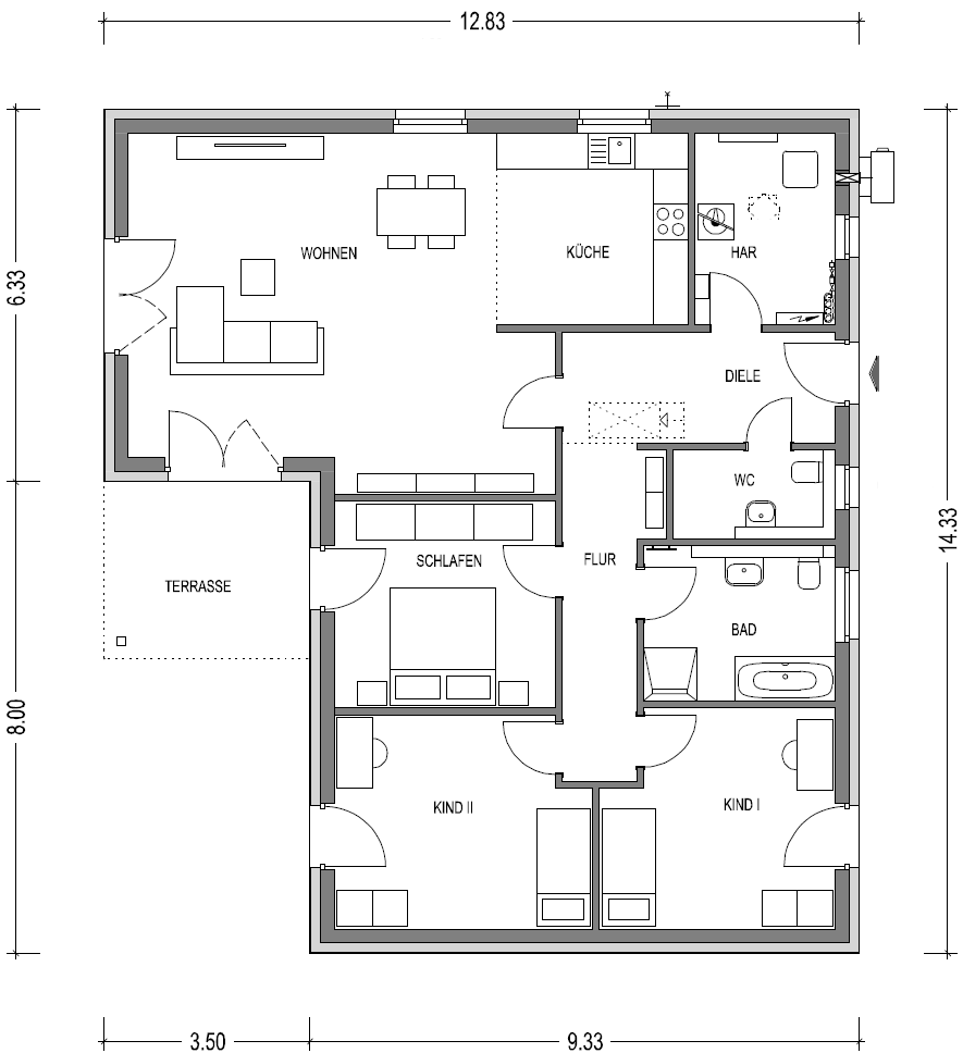 4 Zimmer, Küche, Bad, Gäste-WC, Diele, Flur, HAR